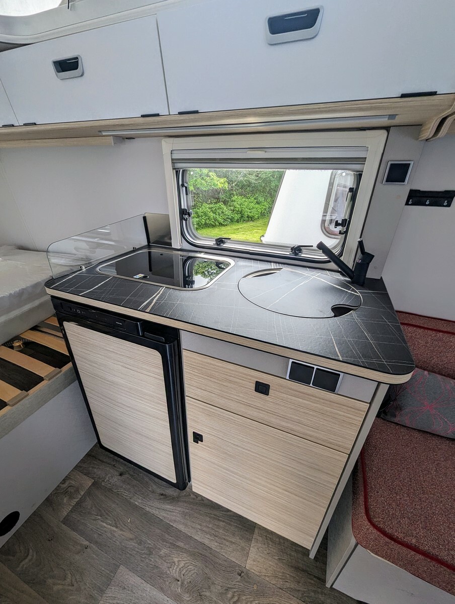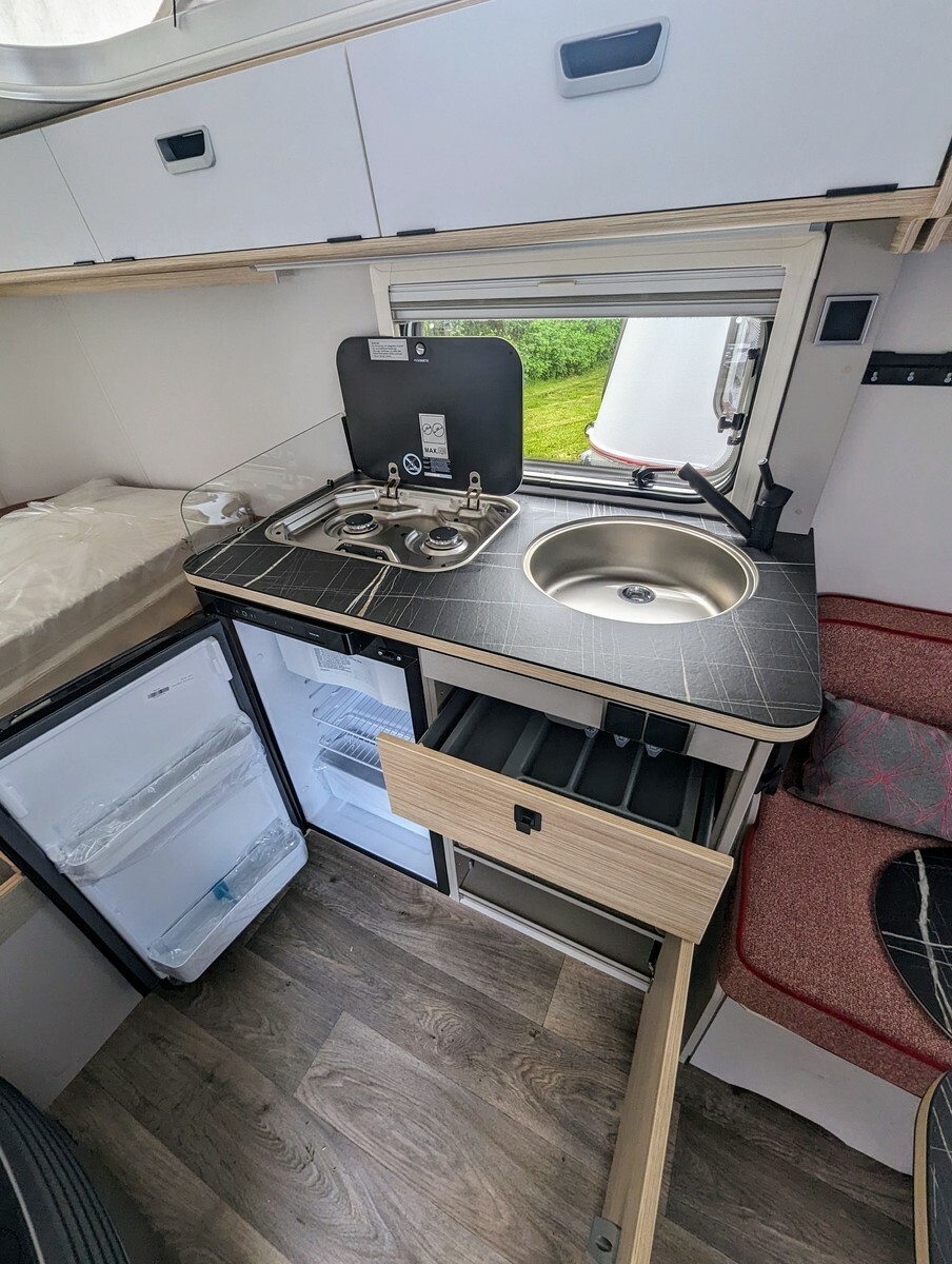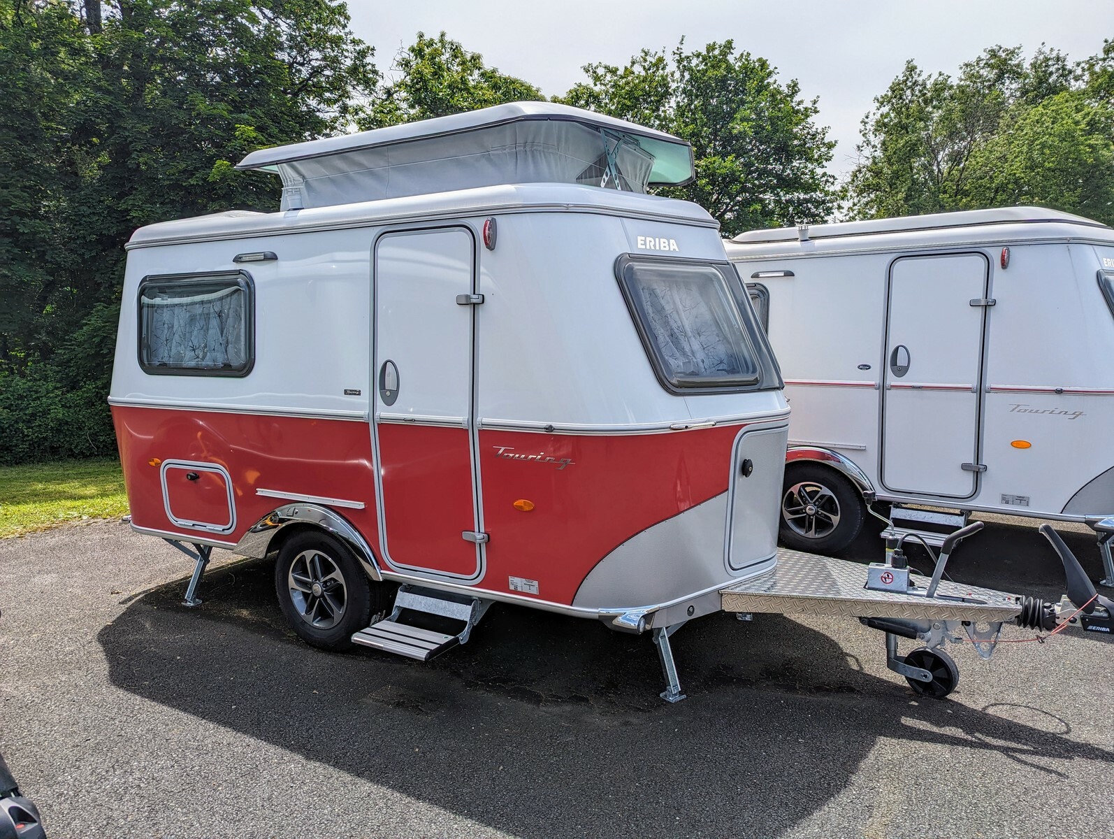 - Pack "Confort Eriba Touring" (moustiquaire de porte cellule, stores plissés confort, prises supplémentaires, couvercle évier avec planche à découper, poubelle intégrée à la porte cellule, miroir grossissant supplémentaire à fixation magnétique),