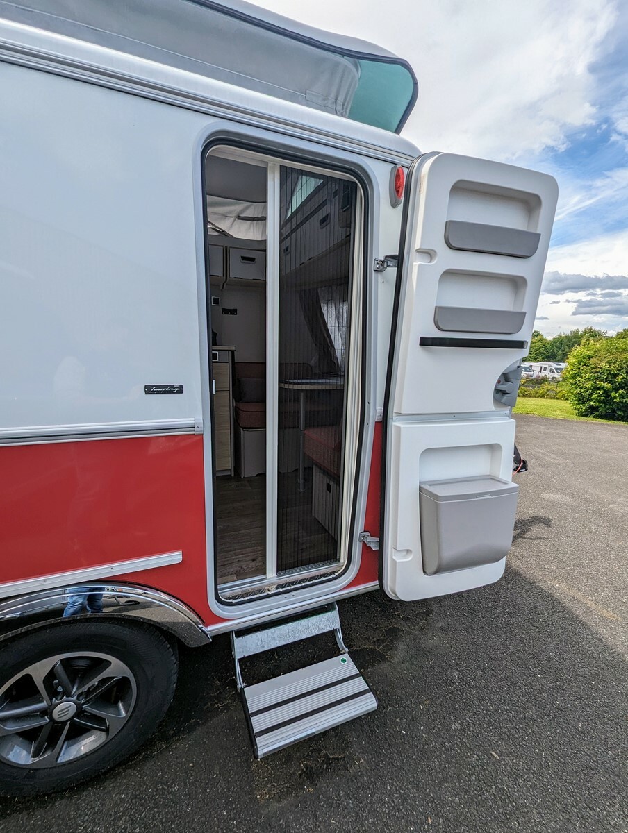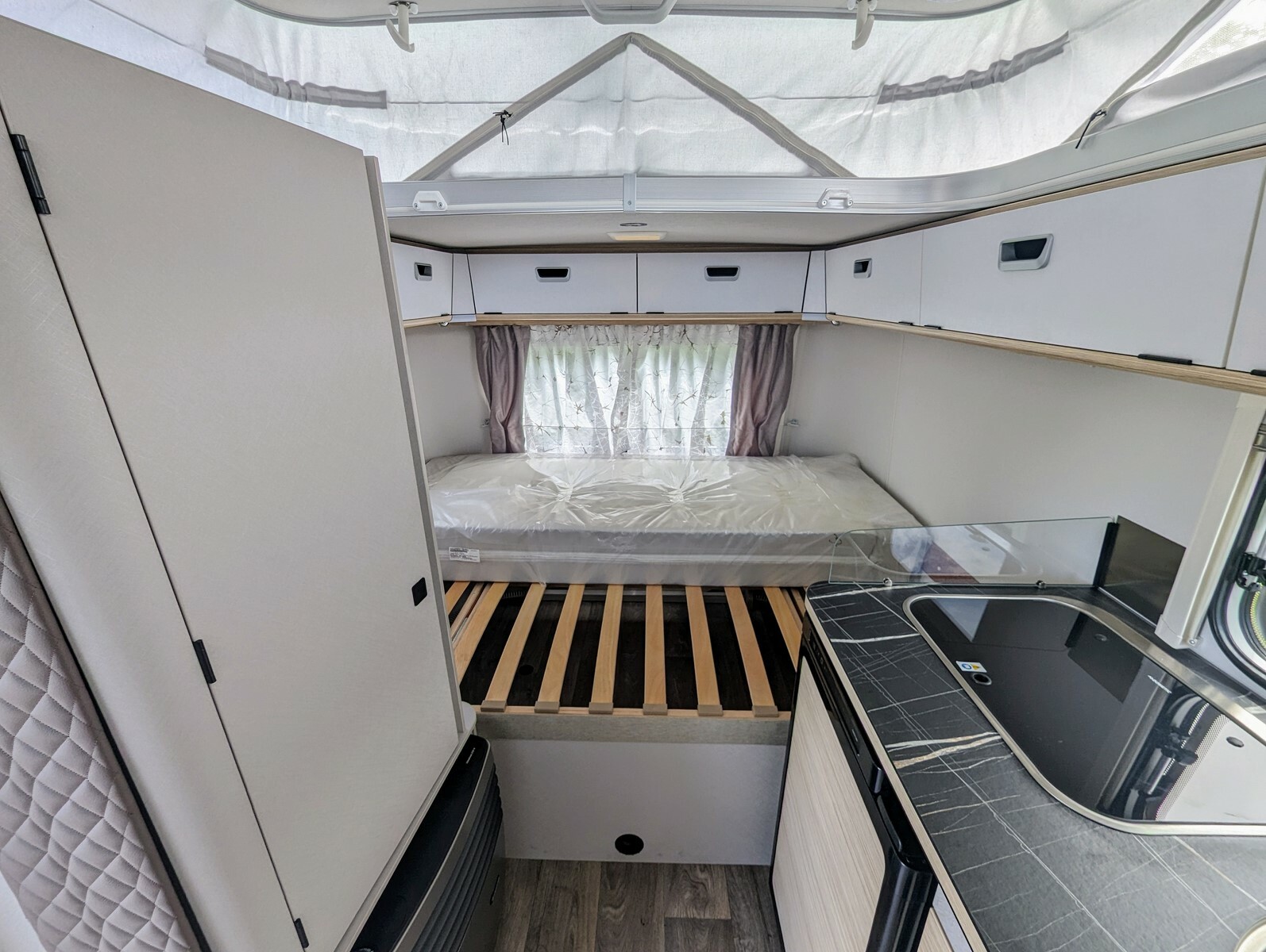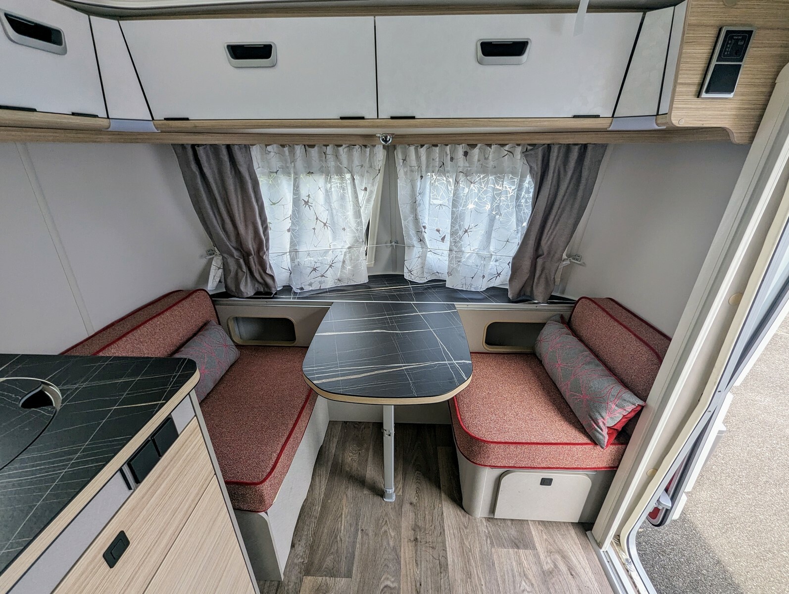 - Pack "Confort Eriba Touring" (moustiquaire de porte cellule, stores plissés confort, prises supplémentaires, couvercle évier avec planche à découper, poubelle intégrée à la porte cellule, miroir grossissant supplémentaire à fixation magnétique),