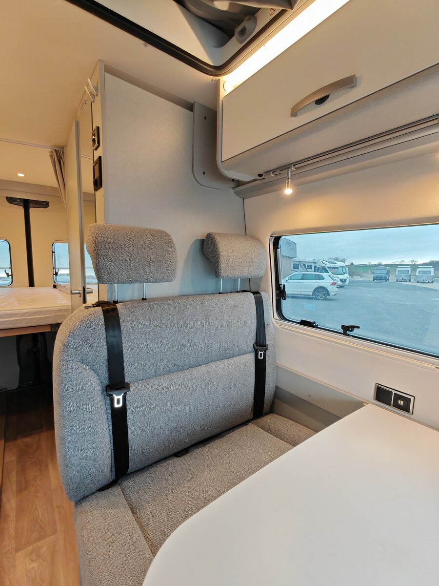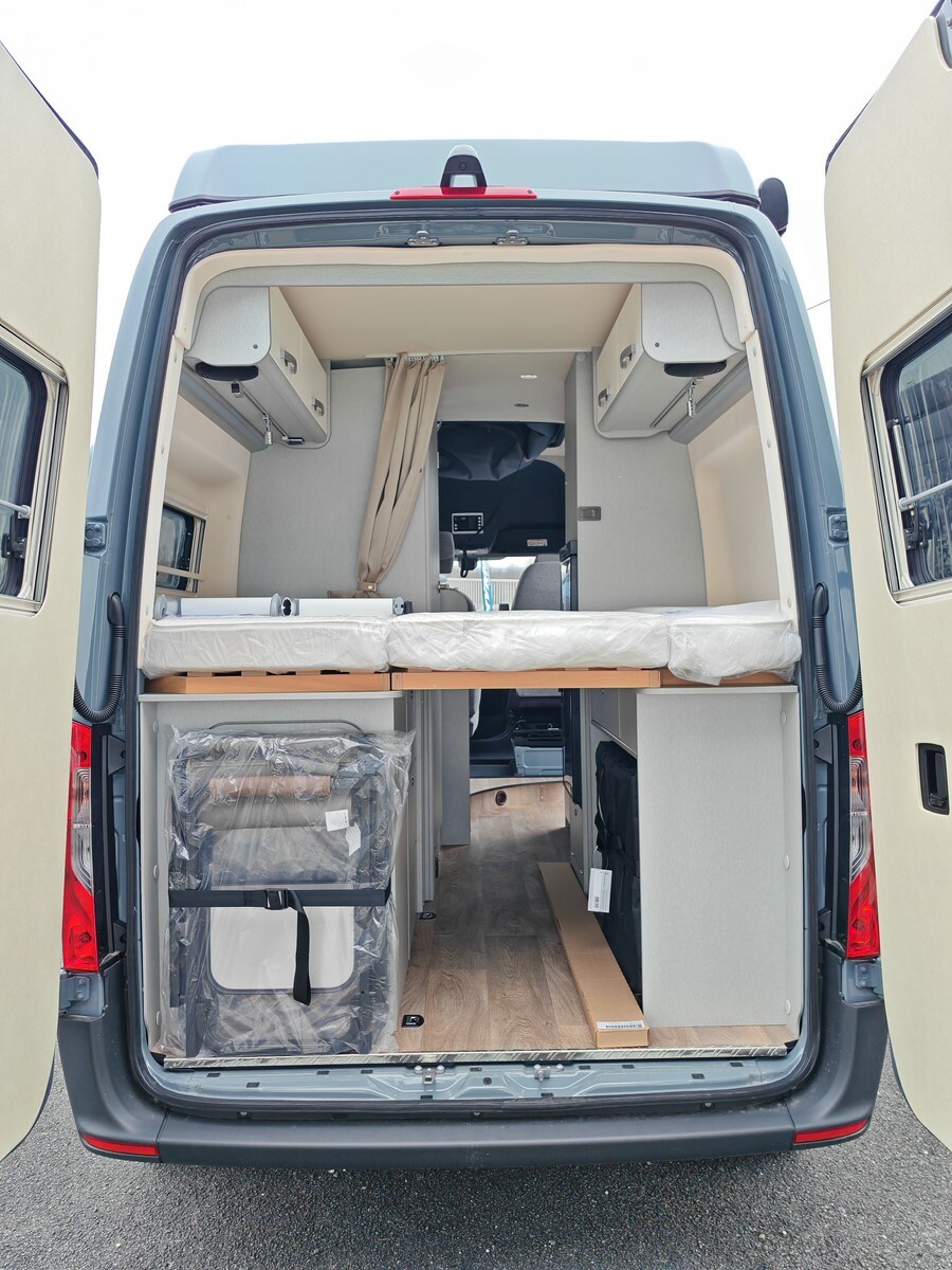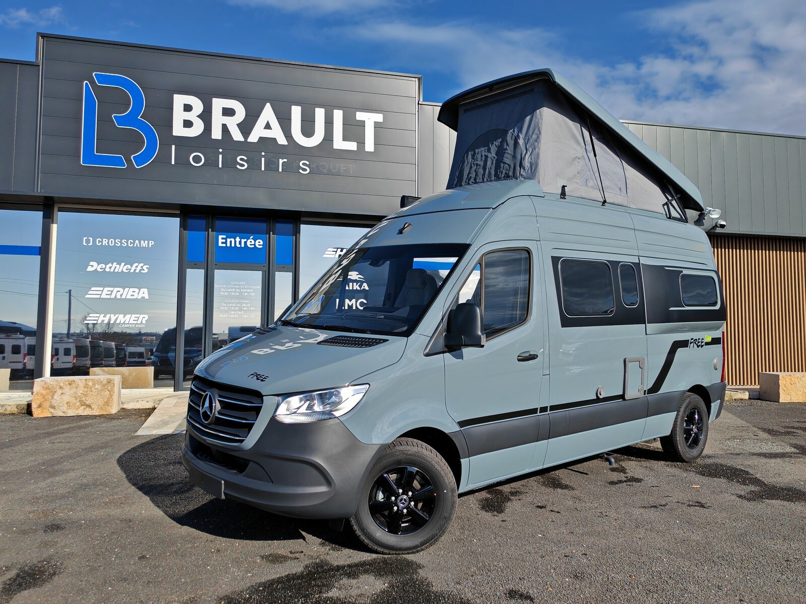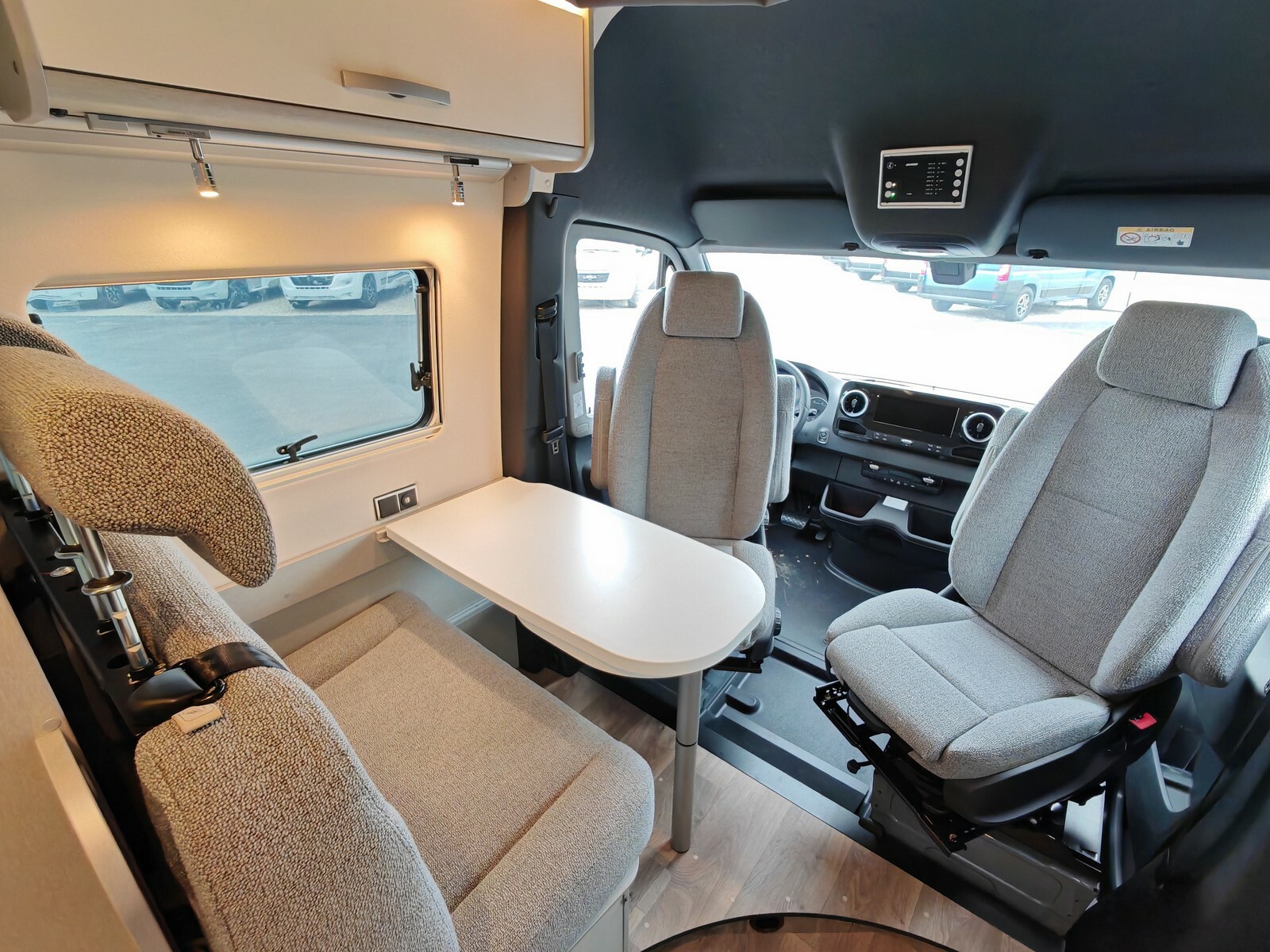 - Pack "Campus" (Régulateur de vitesse actif "Distronic Plus" avec commandes au volant, boîte de vitesse automatique 9G-Tronic, système multimédia MBUX à écran tactile 10.25" avec caméra de recul et navigation, prédisposition audio avec 4 haut-parleurs, instrumentation avec écran "Pixel-Matrix" Mercedes, volant cuir, climatisation semi-automatique "Tempmatic", stores plissés de cabine, prises supplémentaires, réservoir d'eaux usées isolé et chauffé, 2 coussins + pochette de rangement, mobilier coloris blanc, fixations Isofix, sérigraphie noir mat des jupes latérales, store 3m avec boîtier anthracite, toit relevable coloris du véhicule avec couchage double, jantes alu 16" coloris noir avec pneus 4 saisons, bandes décoratives chromées sur la calandre, rétroviseurs électriques et dégivrants, réservoir carburant 92l, peinture coloris gris bleu pastel, motorisation 170 Cv, tissu "Korfu"),