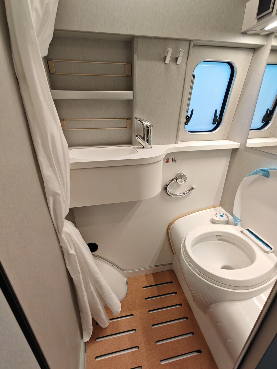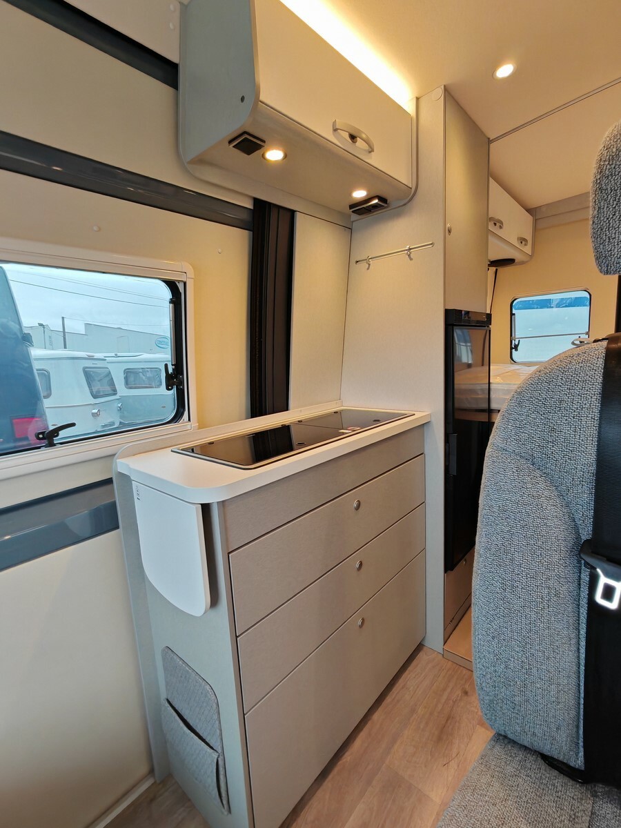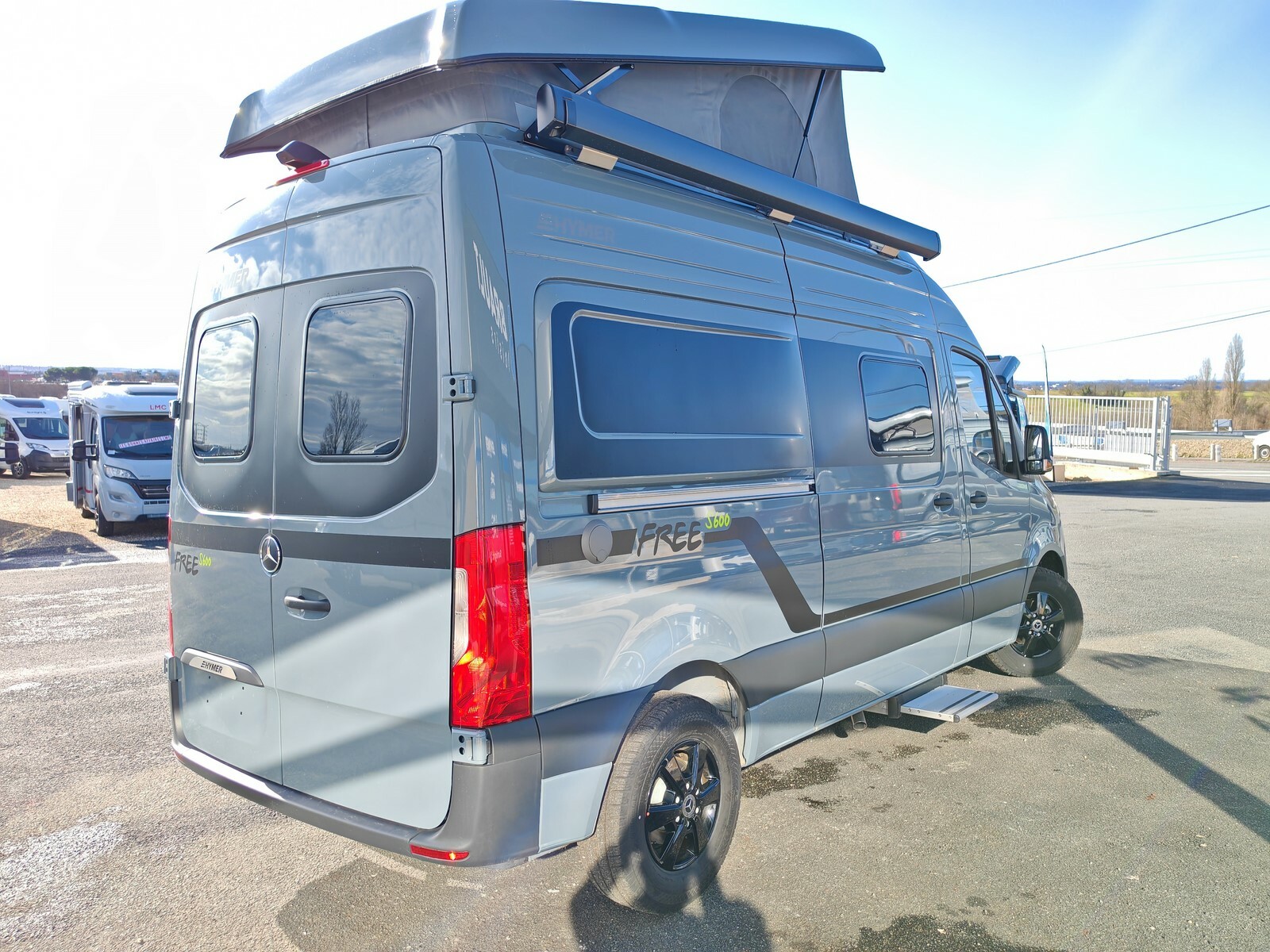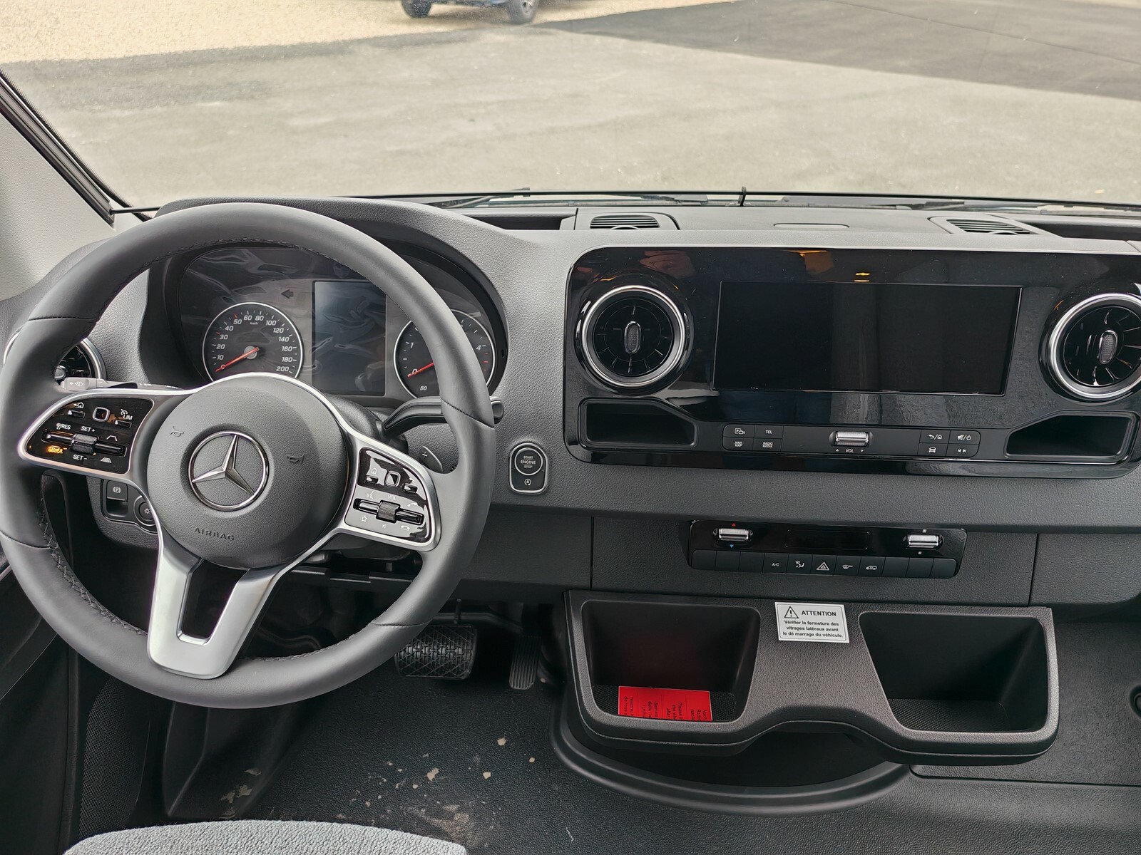 - Pack "Campus" (Régulateur de vitesse actif "Distronic Plus" avec commandes au volant, boîte de vitesse automatique 9G-Tronic, système multimédia MBUX à écran tactile 10.25" avec caméra de recul et navigation, prédisposition audio avec 4 haut-parleurs, instrumentation avec écran "Pixel-Matrix" Mercedes, volant cuir, climatisation semi-automatique "Tempmatic", stores plissés de cabine, prises supplémentaires, réservoir d'eaux usées isolé et chauffé, 2 coussins + pochette de rangement, mobilier coloris blanc, fixations Isofix, sérigraphie noir mat des jupes latérales, store 3m avec boîtier anthracite, toit relevable coloris du véhicule avec couchage double, jantes alu 16" coloris noir avec pneus 4 saisons, bandes décoratives chromées sur la calandre, rétroviseurs électriques et dégivrants, réservoir carburant 92l, peinture coloris gris bleu pastel, motorisation 170 Cv, tissu "Korfu"),