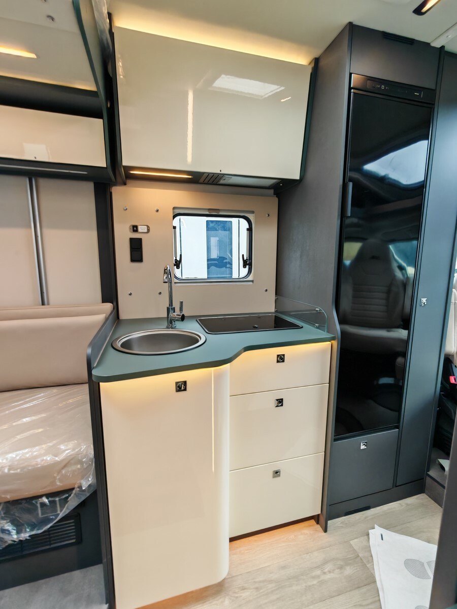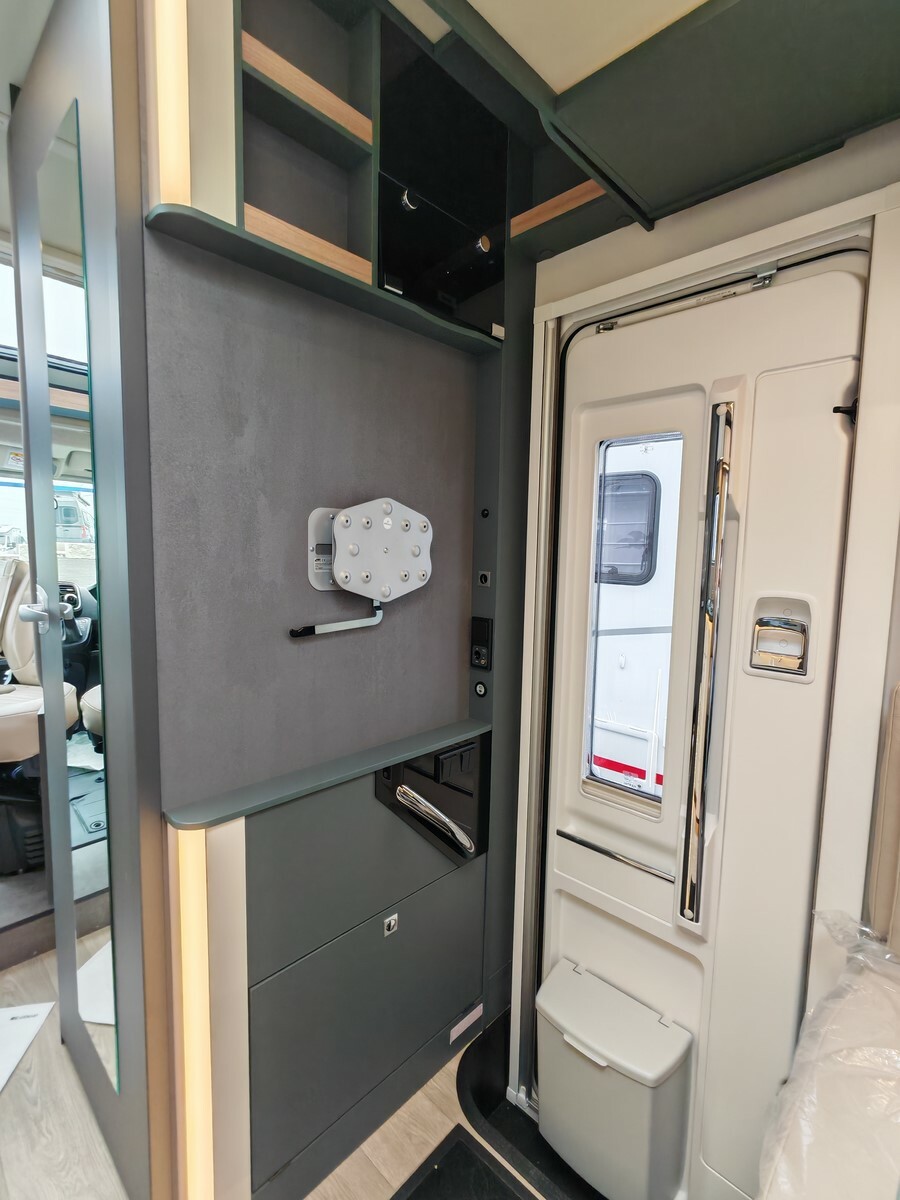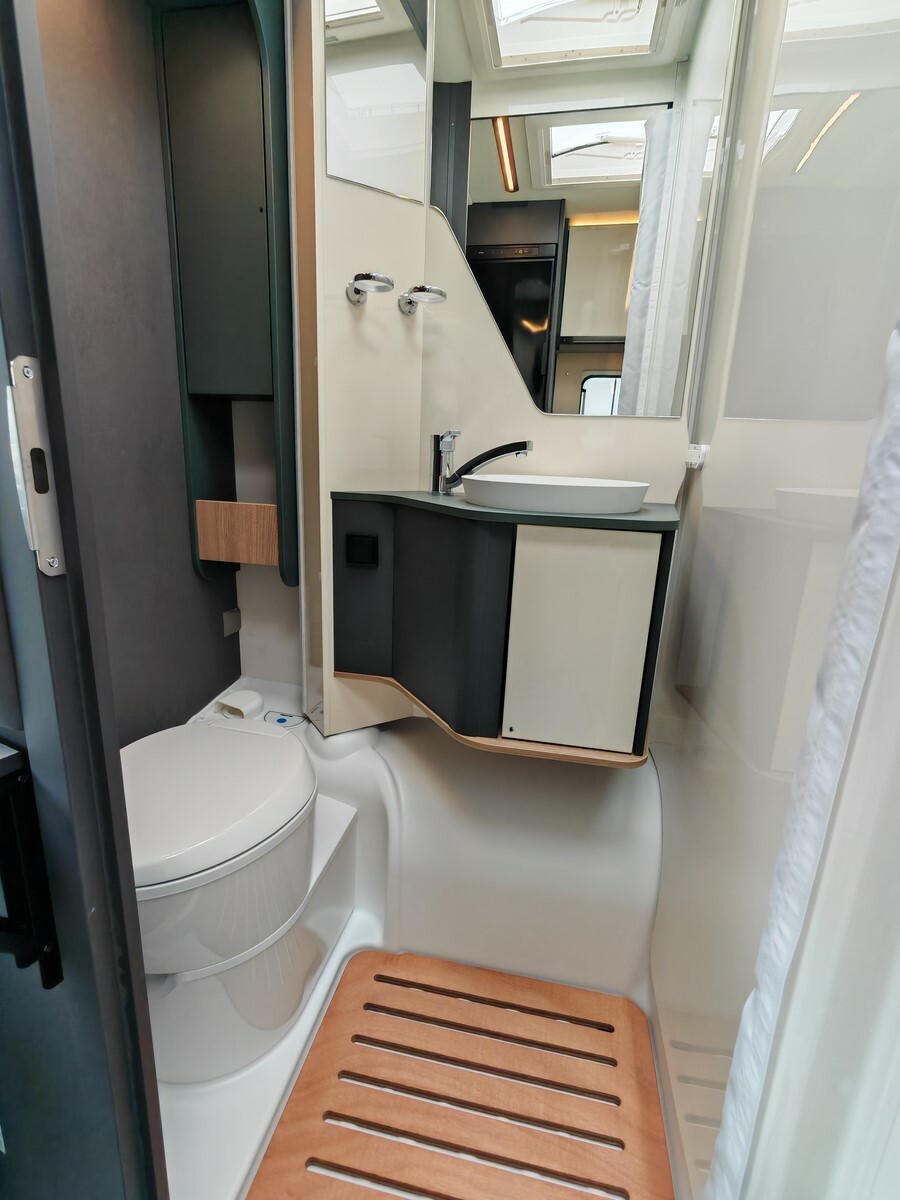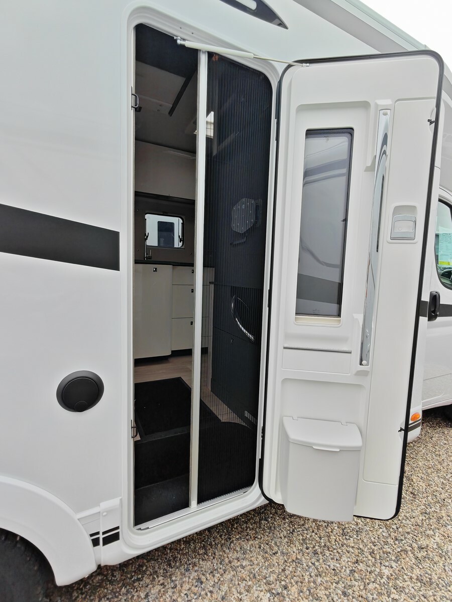 - Pack "One" (réservoir d'eaux usées isolé et chauffé, lanterneau Skyview, hotte aspirante, prédisposition caméra de recul, stores plissés occultants de cabine, prédisposition panneau solaire, caillebotis de douche, tapis de cabine, porte cellule premium XL, habillage des parois de la chambre à coucher arrière en simili-cuir, grand tiroir et porte-bouteille coulissant dans la cuisine),