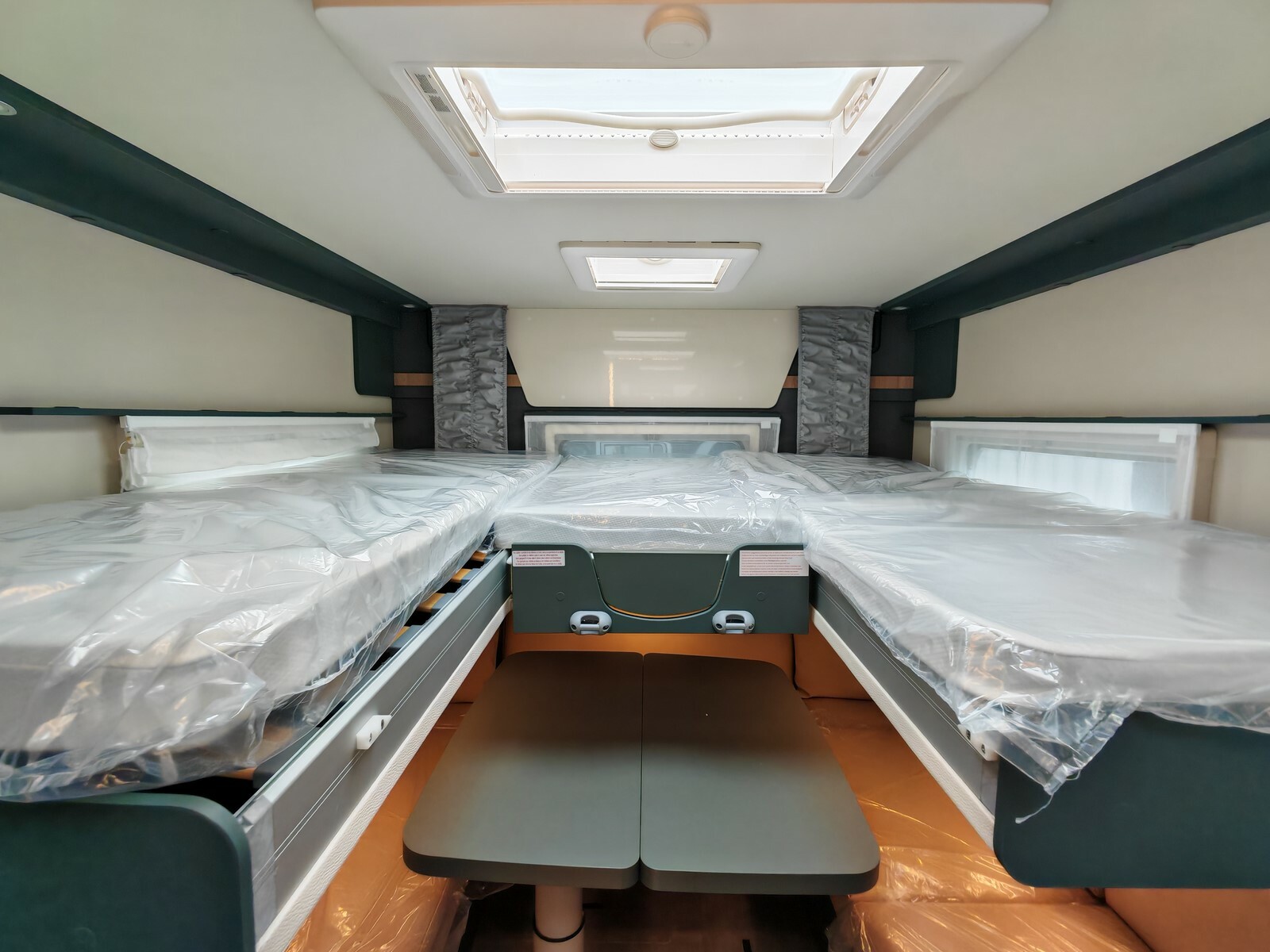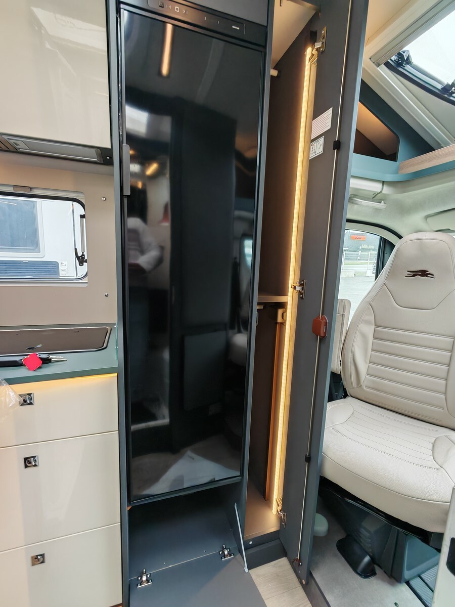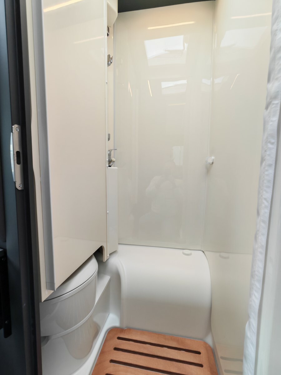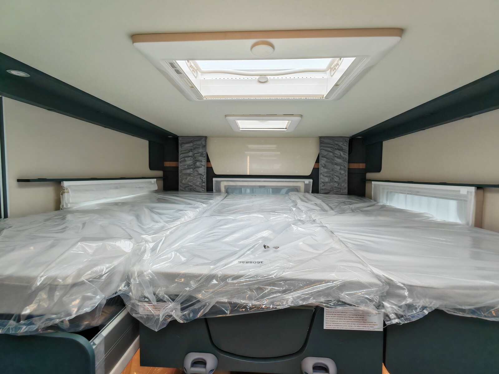 - Pack "One" (réservoir d'eaux usées isolé et chauffé, lanterneau Skyview, hotte aspirante, prédisposition caméra de recul, stores plissés occultants de cabine, prédisposition panneau solaire, caillebotis de douche, tapis de cabine, porte cellule premium XL, habillage des parois de la chambre à coucher arrière en simili-cuir, grand tiroir et porte-bouteille coulissant dans la cuisine),